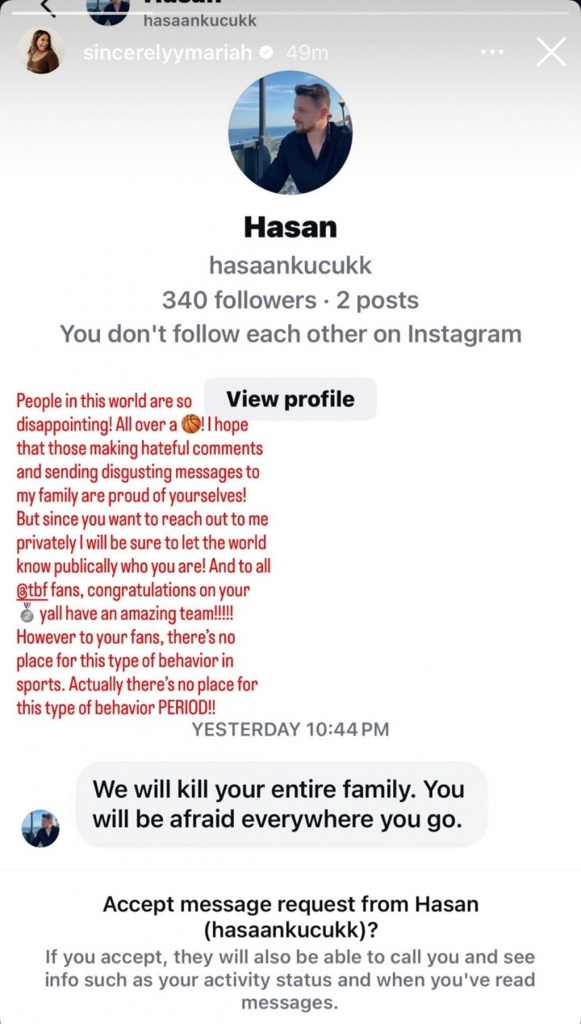 “这世界上的有些人真的让人失望!就因为一场篮球比赛,那些向我的家人发送仇恨言论、发送恶心信息的人,希望你们好自为之!”