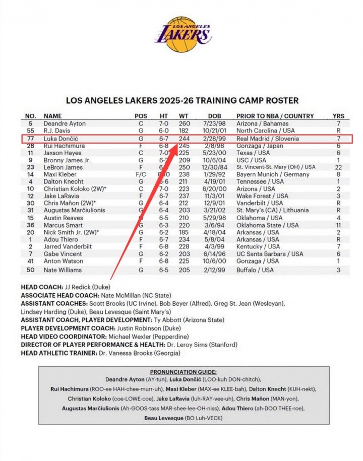 从名单中可以看到,东契奇体重为244磅(110kg)。而值得一提的是,上赛季东契奇开赛时的体重为230磅(104kg)。