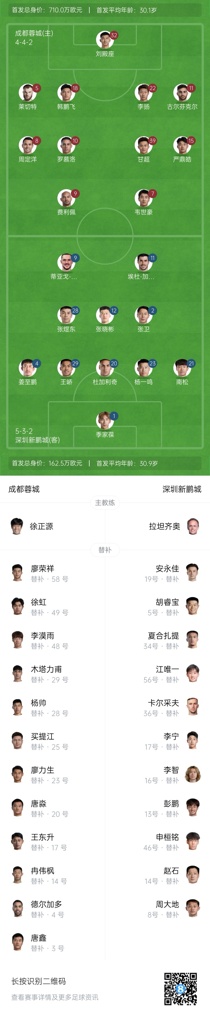 06月25日讯 北京时间20:00,中超第15轮,成都蓉城主场迎战深圳新鹏城。赛前,双方首发出炉!