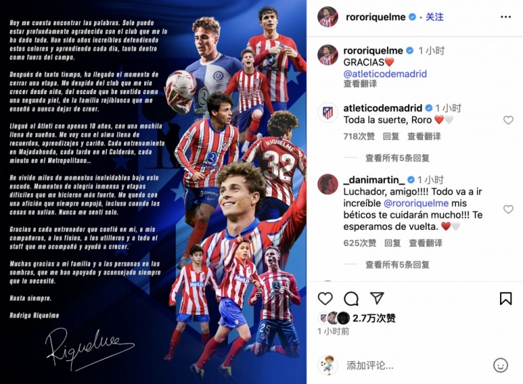 7月4日讯 马竞今日官方宣布,罗德里戈-里克尔梅正式转会皇家贝蒂斯。里克尔梅更新社交媒体发长文深情告别青训母队马德里竞技。