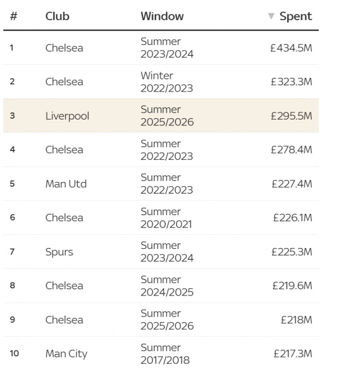 据天空体育统计,利物浦2.955亿镑在英超历史支出榜排名第三,少于切尔西2022-23赛季冬窗以及2023-24赛季夏窗支出。