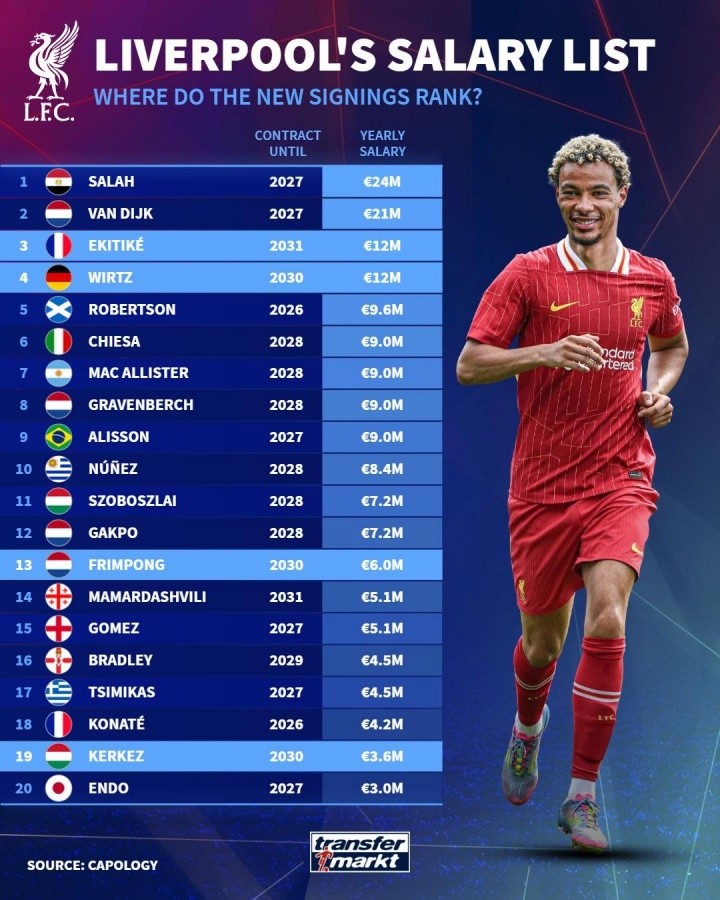 08月04日讯 近日,德转根据著名足球金融机构capology的数据,列出了利物浦目前队内的薪资排行,其中新援埃基蒂克和维尔茨以1200万欧年薪并列第3,弗林蓬600万欧位列第13,科尔克兹仅列第19。