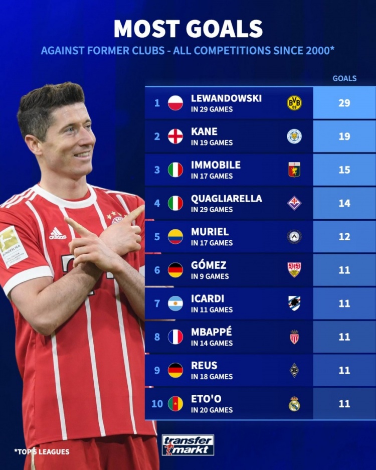 9月14日讯 德国转会市场统计了本世纪五大联赛球员对阵老东家的进球数量,并列出榜单,莱万对阵多特打进29球居首,凯恩对阵莱斯特城攻入19球次席。