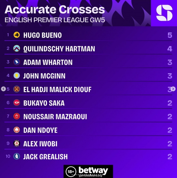 9月24日讯 英超第5轮战罢,squawkafootball列各项数据排行,狼队后卫乌戈-布埃诺是精准传中次数最多的球员,共5次。
